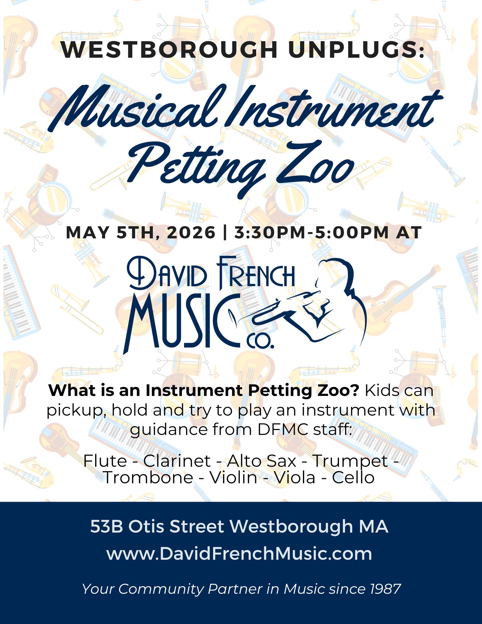 Stop by David French Music on Tuesday, May 5th 2026 for a Musical Instrument Petting Zoo!